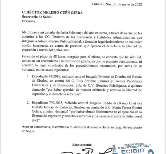 En la circular 01666/22, se ordenaba a funcionarios retirar demandas contra periodistas, en caso de tenerlas o renunciar a su cargo. Culiacán, Sinaloa, a 11 de mayo del 2022.- Una vez agotado el plazo de 48 horas que dio el gobernador Rubén Rocha Moya a los titulares de las Secretarías y entidades de la administración […]