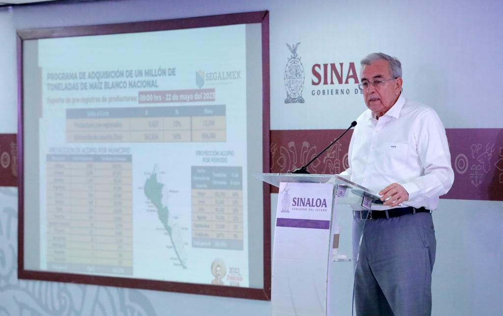 Culiacán, Sinaloa, a 22 de mayo de 2023.- El esquema acordado para la comercialización del maíz, que consiste en la compra por parte de Segalmex de un millón 500 mil toneladas a pequeños productores desde 10 hasta 20 hectáreas, y en el caso de los productores de 10 hectáreas ya se tiene un avance del 72 por ciento, pues se tienen registrados un total de 9 mil 627 productores, con una cosecha estimada en más de 562 mil toneladas, informó el gobernador Rubén Rocha Moya.