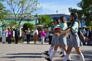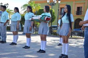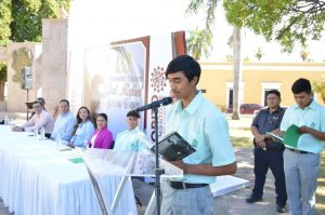 En se sentido, con mucho orgullo iniciaron el protocolo cívico con los respectivos izamientos de bandera, primeramente en la Plazuela “Los Tres Grandes”, posteriormente en el recinto identificado como Hemiciclo “Gral. Rafael Buelna Tenorio”, en donde procedieron con los honores correspondientes a los lábaros patrios, para luego dar paso al Discurso Oficial a cargo del alumno: Michel Pascacio Cota López, quien resumió una interesante semblanza, en la que resaltó los dotes intelectuales y valor que mostró Rafael Buelna desde su niñez, mismos que conservó como estudiante, los cuales consolidó como protagonista de la revolución, siendo apodado “El Granito de Oro” por su gran valor y considerado el general más joven del movimiento armado.