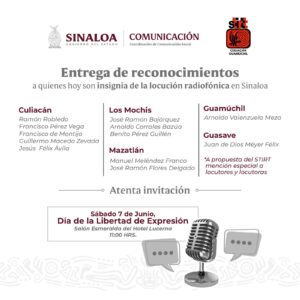 Culiacán, Sinaloa 04 de junio de 2025.- En el marco de la conmemoración del Día de la Libertad de Expresión el próximo sábado 07 de junio, el Gobierno del Estado de Sinaloa, a través de la Coordinación de Comunicación Social y el Sindicato de Trabajadores de la Industria de la Radio y la Televisión delegaciones Culiacán, Mazatlán y Los Mochis, llevará a cabo una ceremonia de entrega de reconocimientos a 12 locutores que son parte de la generación que hoy por hoy es la más antigua, y que han hecho su carrera en las distintas regiones de la entidad.