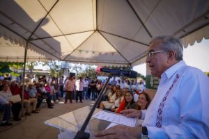El mandatario estatal fue recibido por la presidenta municipal, María Elizalde Ruelas, en esta comunidad donde el gobernador dijo sentirse literalmente en casa, pues recordó que aquí vivió en su infancia, e incluso cursó el quinto año en la escuela primaria, la cual será rehabilitada, en respuesta a la petición que le hizo su maestra acompañada de varios niños, para el equipamiento de mobiliario, la reparación de los techos y la construcción de un aula de medios.