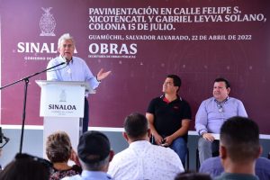 Guamúchil, Salvador Alvarado, Sinaloa, a 22 de abril de 2022.- Durante una gira de trabajo por la región del Évora, el gobernador Rubén Rocha Moya puso en marcha la pavimentación de nuevas vialidades, la primera de ellas en Alhuey, Angostura, y dos más en la ciudad de Guamúchil, que totalizan una inversión de 15 millones 165 mil pesos de recursos estatales, en favor de ambos Ayuntamientos, tanto de Angostura, como de Salvador Alvarado.