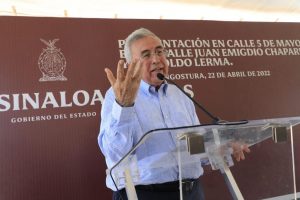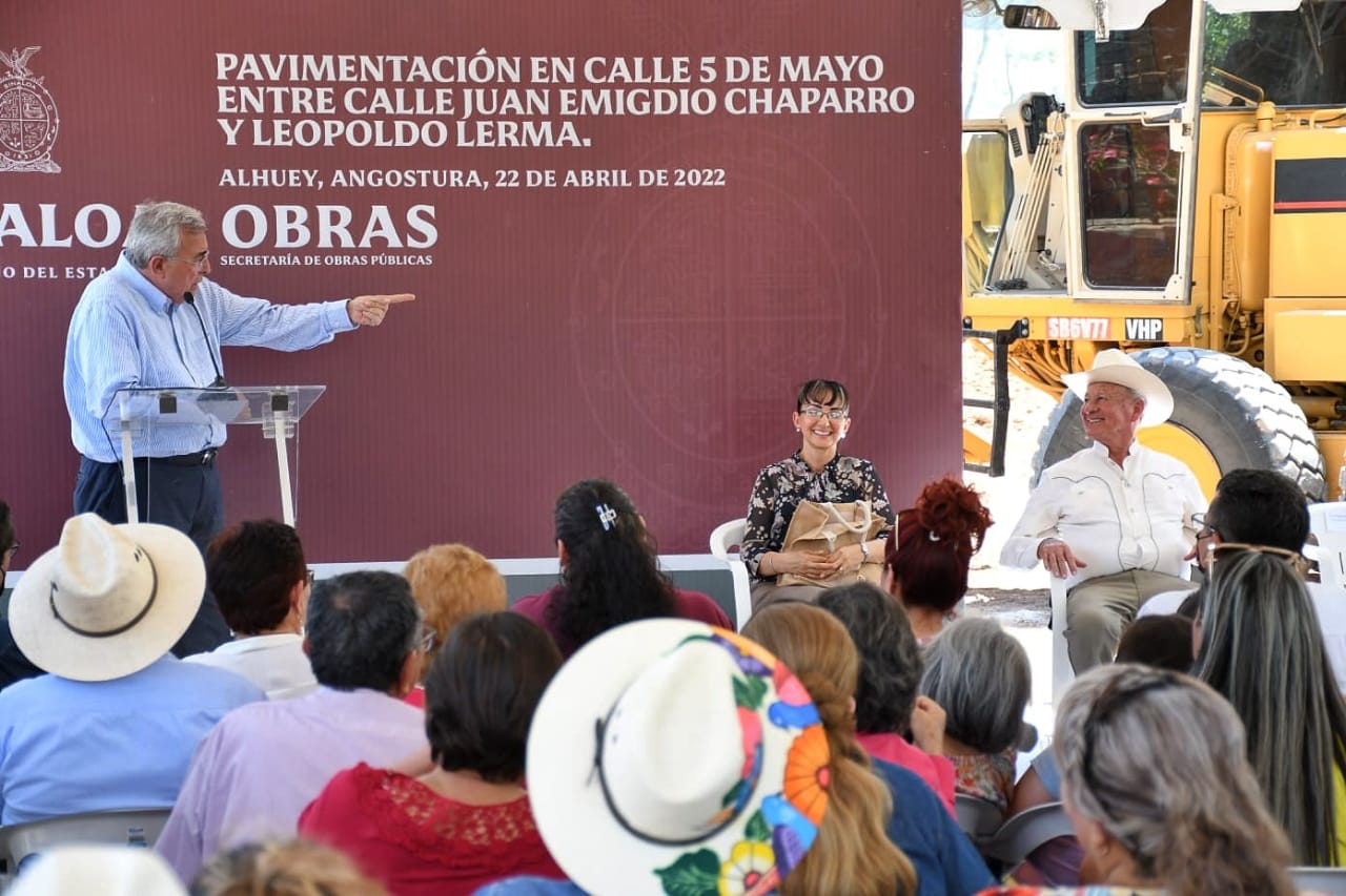 Como primera actividad, el mandatario estatal arribó a la sindicatura de Alhuey, donde fue recibido por el presidente municipal de Angostura, Miguel Ángel Angulo Acosta, para dar el banderazo de inicio de pavimentación de la calle 5 de Mayo, que se trata de una continuación de 300 metros de longitud, vialidad que quedará totalmente pavimentada con concreto hidráulico hasta donde topa con el dren agrícola.
