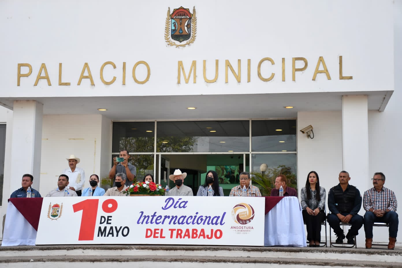 Angostura, Sinaloa. 1 de mayo del 2022. Autoridades de Angostura, encabezadas por el presidente municipal, Miguel Ángel Angulo Acosta, líderes sindicales y personal del Ayuntamiento celebraron con un acto cívico está mañana el Día del Trabajo, en donde se recordó aquellas personas que lucharon para lograr todos los beneficios laborales que hoy se tienen.